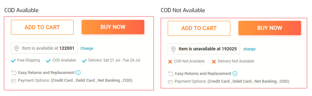 • 4. How will I know whether COD is available on my product? If COD option is available, it is mentioned on the particular product page (refer to the screenshot below). However, if case of any special discount or offer, COD may not be available.